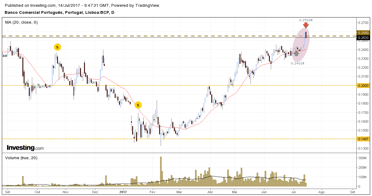 BCP veio também ao anterior máximo nos 0,2456 para o testar.