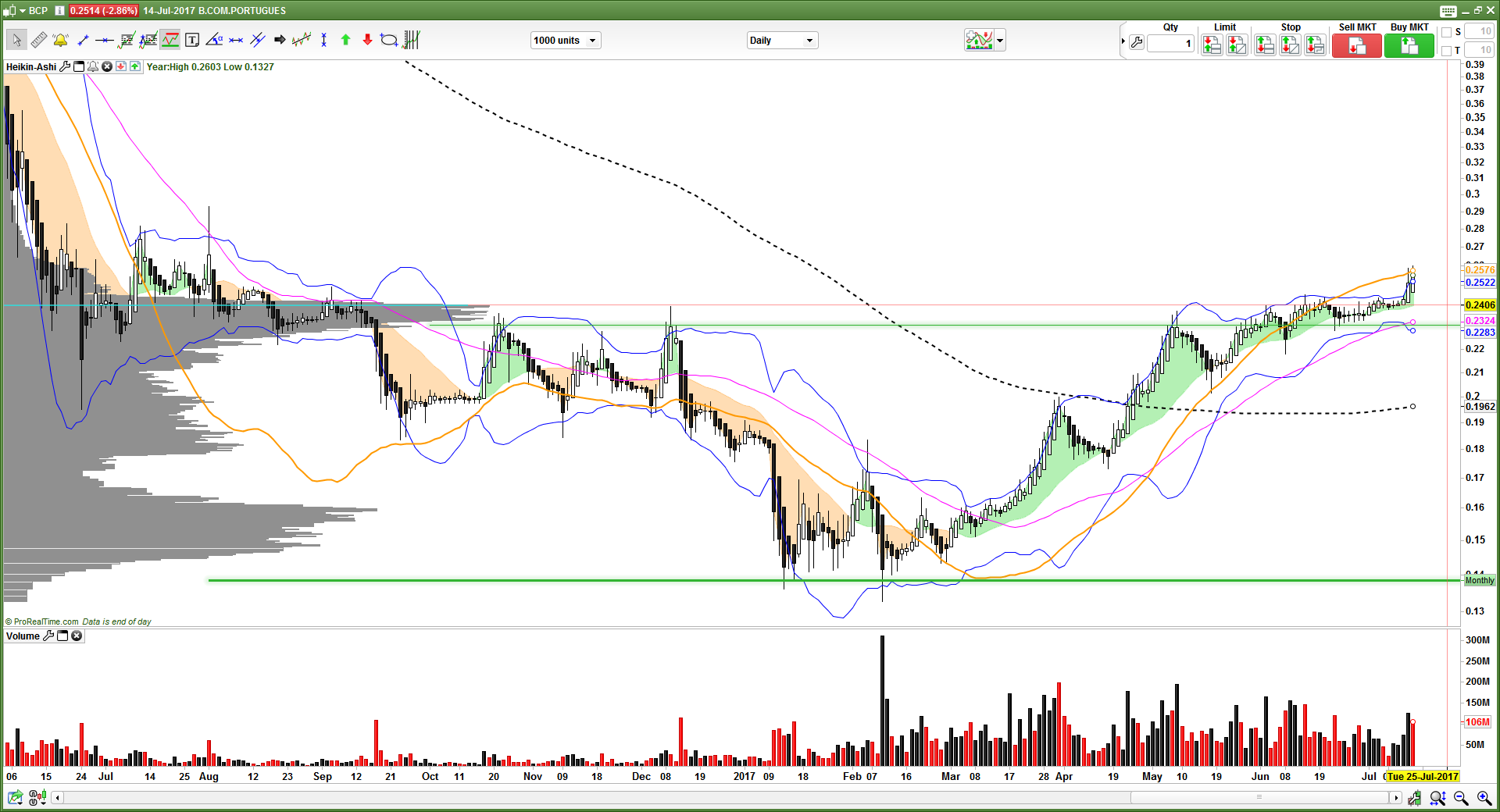 Completamente cilindrado por esta descida. Estava à espera de ver a cotação nos 0,28 ainda esta semana, depois de a ver nos 0,26 e sem referenciar qualquer resistência notória a partir desse valor e, espantosamente, volto a ver a cotação abaixo dos 0,245. Os mais de 6% que subiu num dia, perdeu nos dois dias seguintes e, a continuar assim, vai ser difícil nos tempos mais próximos ver a cotação do BCP a atingir os 0,30.