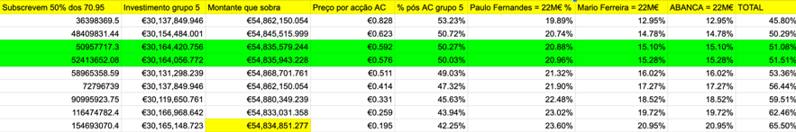 Um detalhe curioso é que no cenário 3B para os 5 terem mais de 50% após AC, e o Paulo Fernandes, Mário Ferrreira e Abanca terem juntos 51% forçosamente terão que investir mais de 20M€ cada o que vai ao encontro das notícias do Expresso.