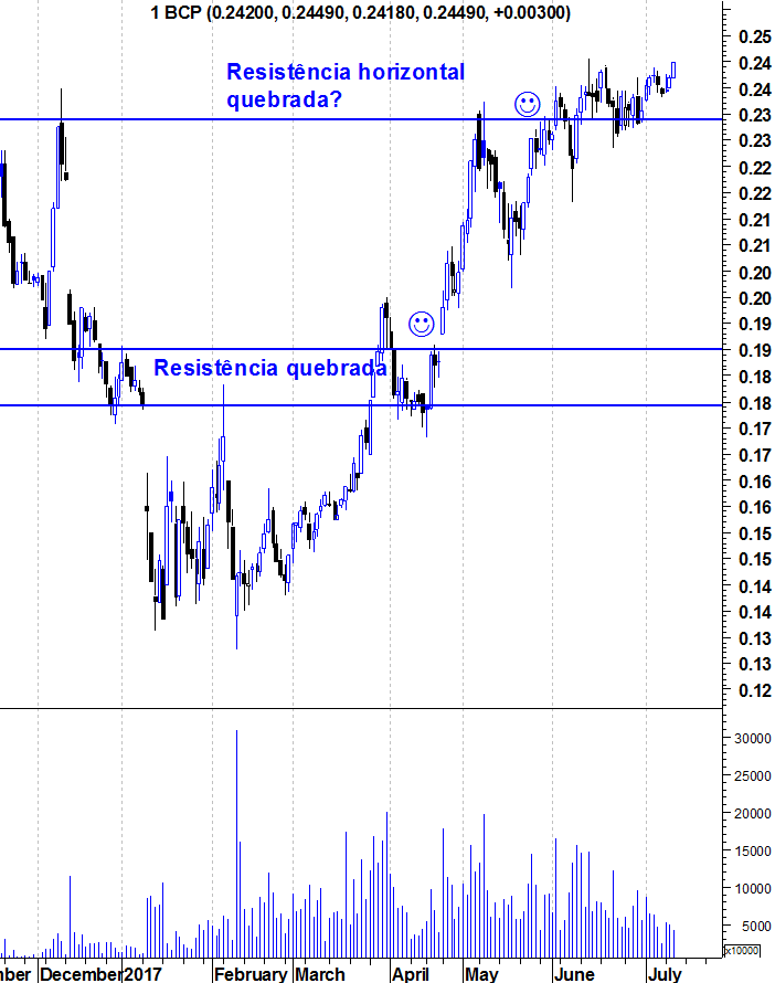 O BCP continua a dar sinais de quebra da resistência e os touros continuam no comando da acção em todos os horizontes temporais. Já lá vão 6 meses de subidas.