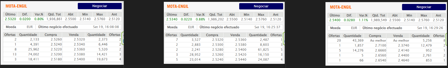 No nível dos 2,52 / 2,522, entravam sistematicamente pequenas ordens, conforme iam roendo os 2,52. Algum atrevido, tal como eu, fui buscar a 2,522 quando estavam a 2,52. Apanhei dos dois preços.