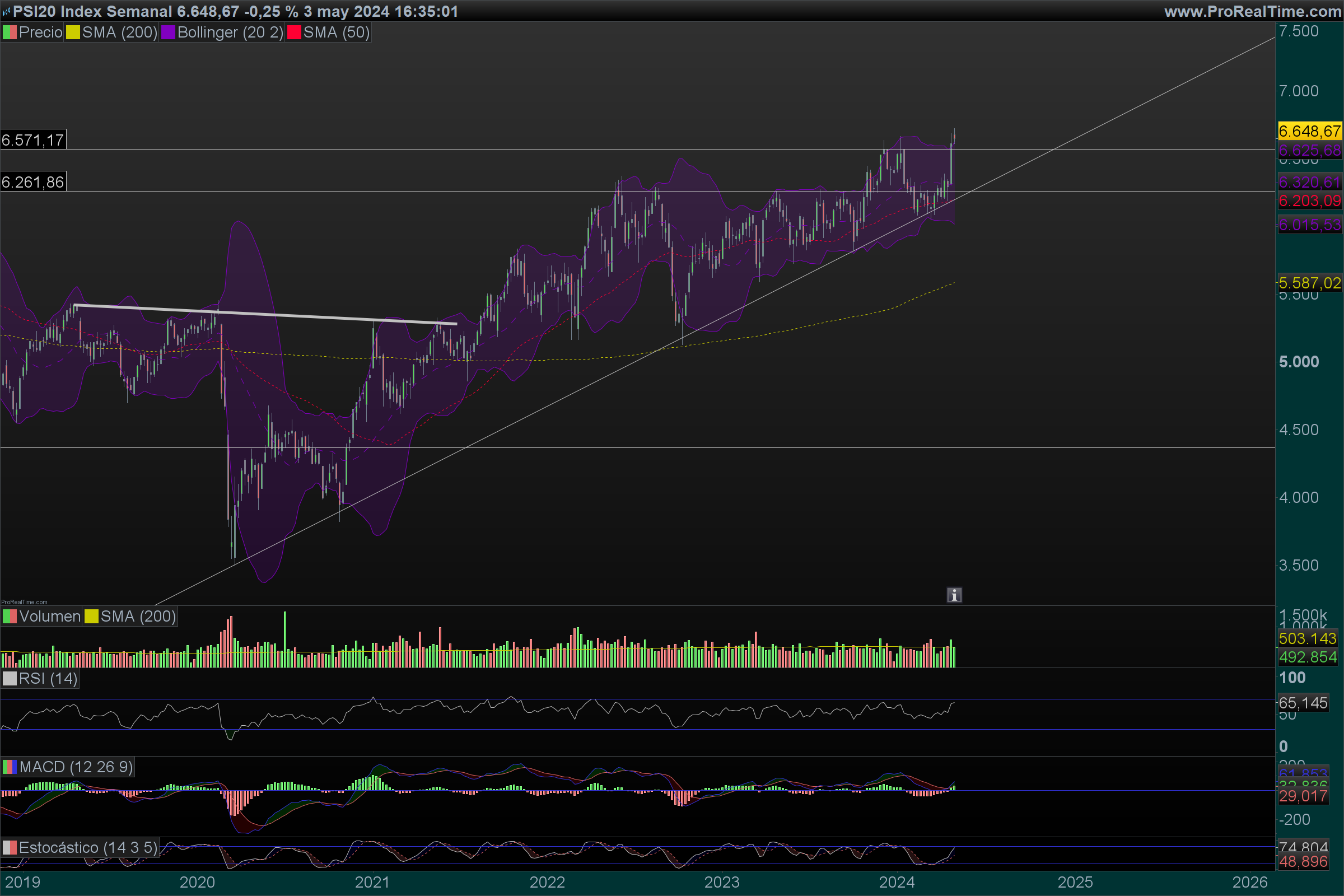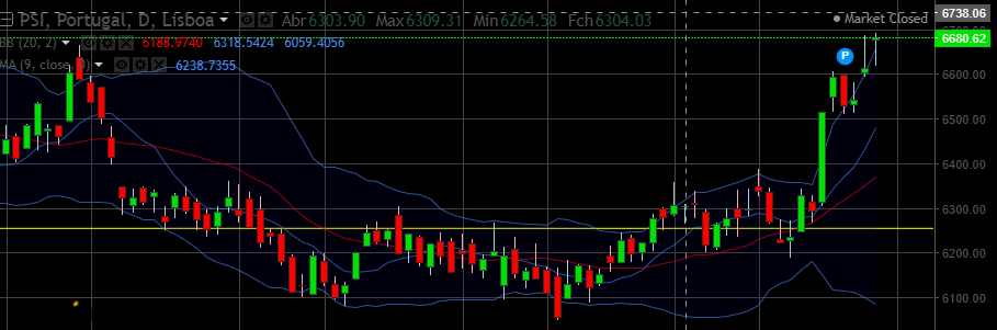 Acima dos 6720 e a subir mais de 1%, o PSI visita valores que não se viam desde Julho de 2014. Estes valores atingindos nas últimas sessões são máximos de quase 10 anos.