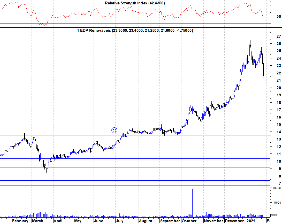 - Ou sou eu que sou completamente ingénuo ou então não sei. Isto é o mercado bolsista. Subidas acontecem, quedas também. A EDPR hoje quebrou um ponto nos 22,60€ que certamente criou alarme a vários investidores. O porquê desta queda? Eu não sei, nem consigo especular. Os parâmetros técnicos estavam sim altos, mas agora estão em mínimos de vários meses. Quanto mais atenção uma cotada atrai, mais exigente se tornam os investidores. Os tubarões ao mínimo sinal saltam fora, não estão para perder os seus preciosos ganhos. Doido seria pensar que todos os investidores da EDPR só pensam em vender as suas participações em 2050.