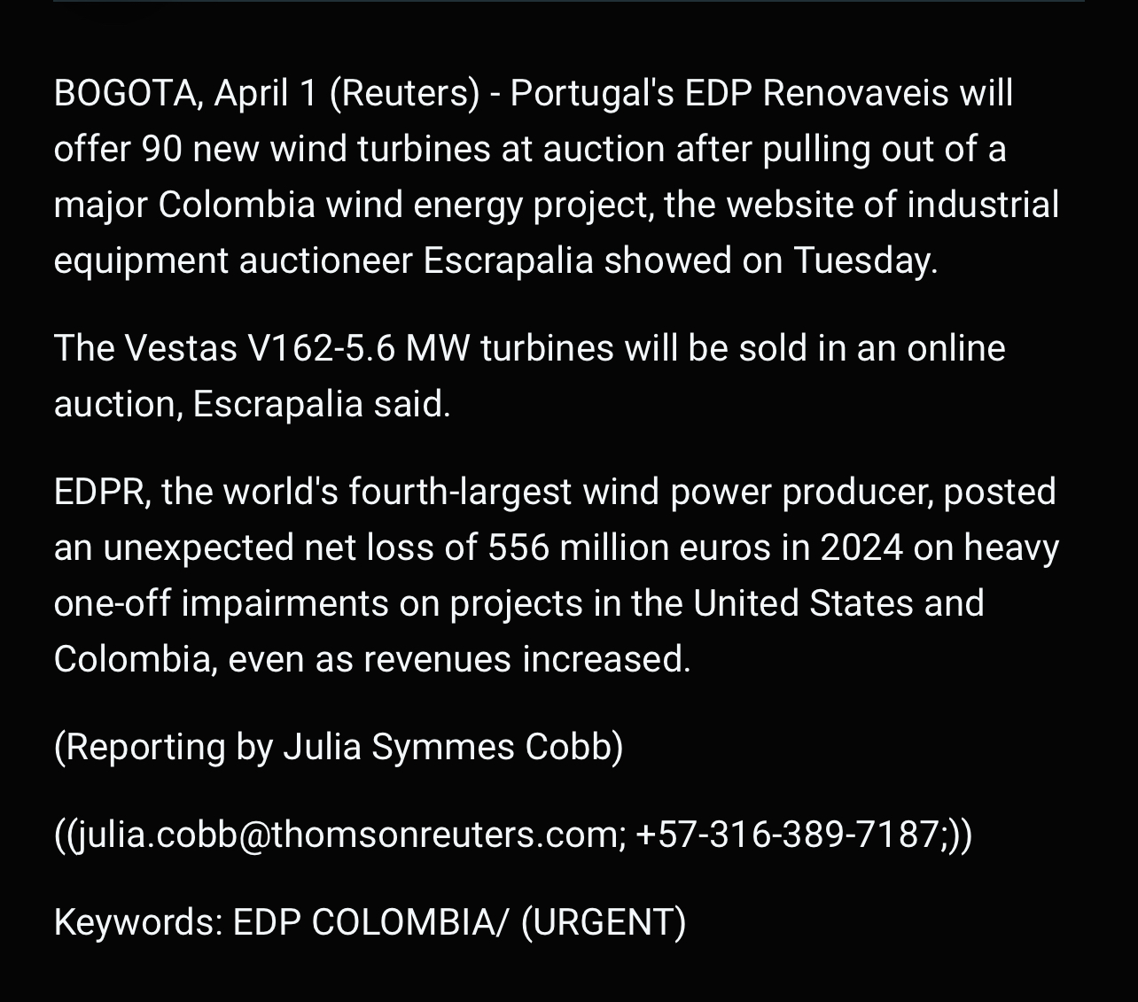 EDPR, the world's fourth-largest wind power producer, posted an unexpected net loss of 556 million euros in 2024 on heavy one-off impairments on projects in the United States and Colombia, even as revenues increased.