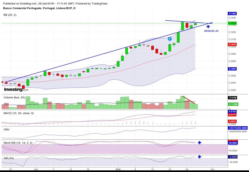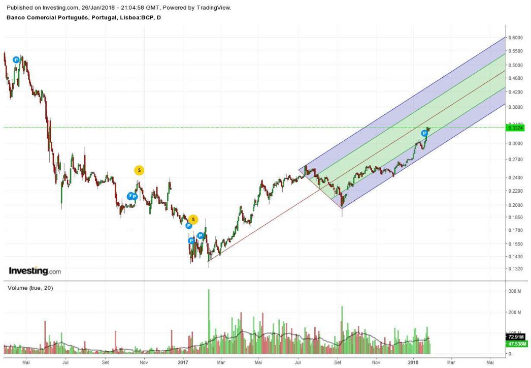 O bcp a par do psi,continua uma boa aposta.Os 0.30cts foram ultrapassados com facilidade e desta forma o próximo target está entre os 0.403->0.413cts.Esta zona será importante para continuar a definir o rumo da cotada no longo prazo pois apresenta um ângulo 180graus face ao topo anterior e que, caso não seja ultrapassado em alta, poderá corresponder a zona de inversão,mas até lá siga o baile e as retraçoes deverão ser aproveitadas para novas entradas