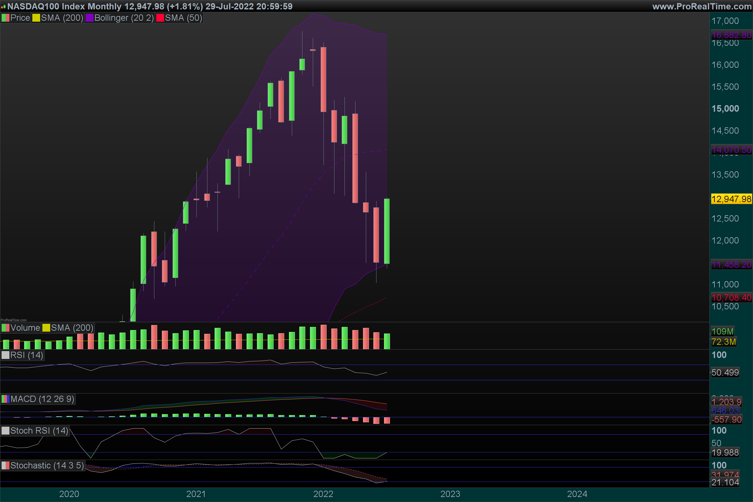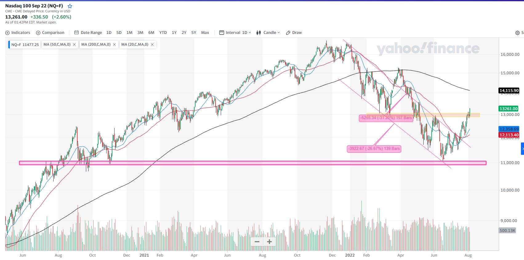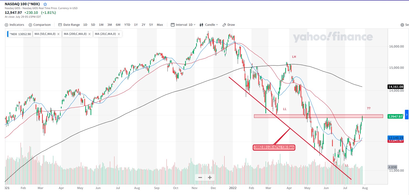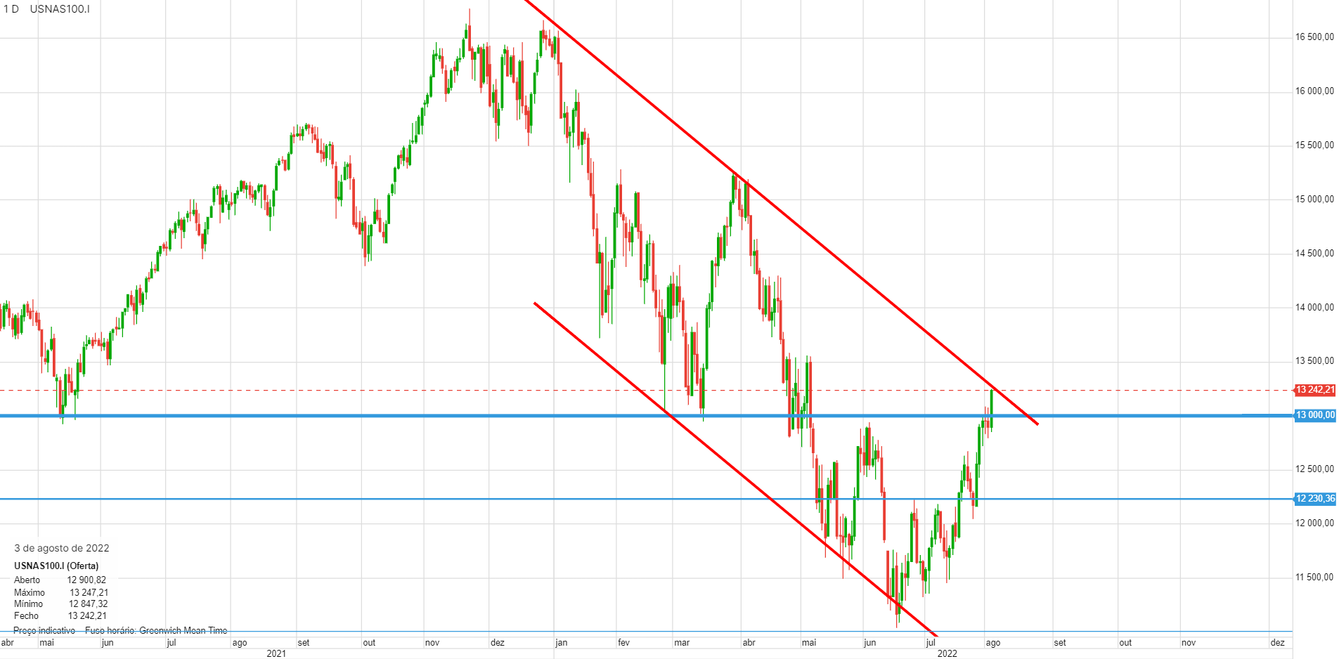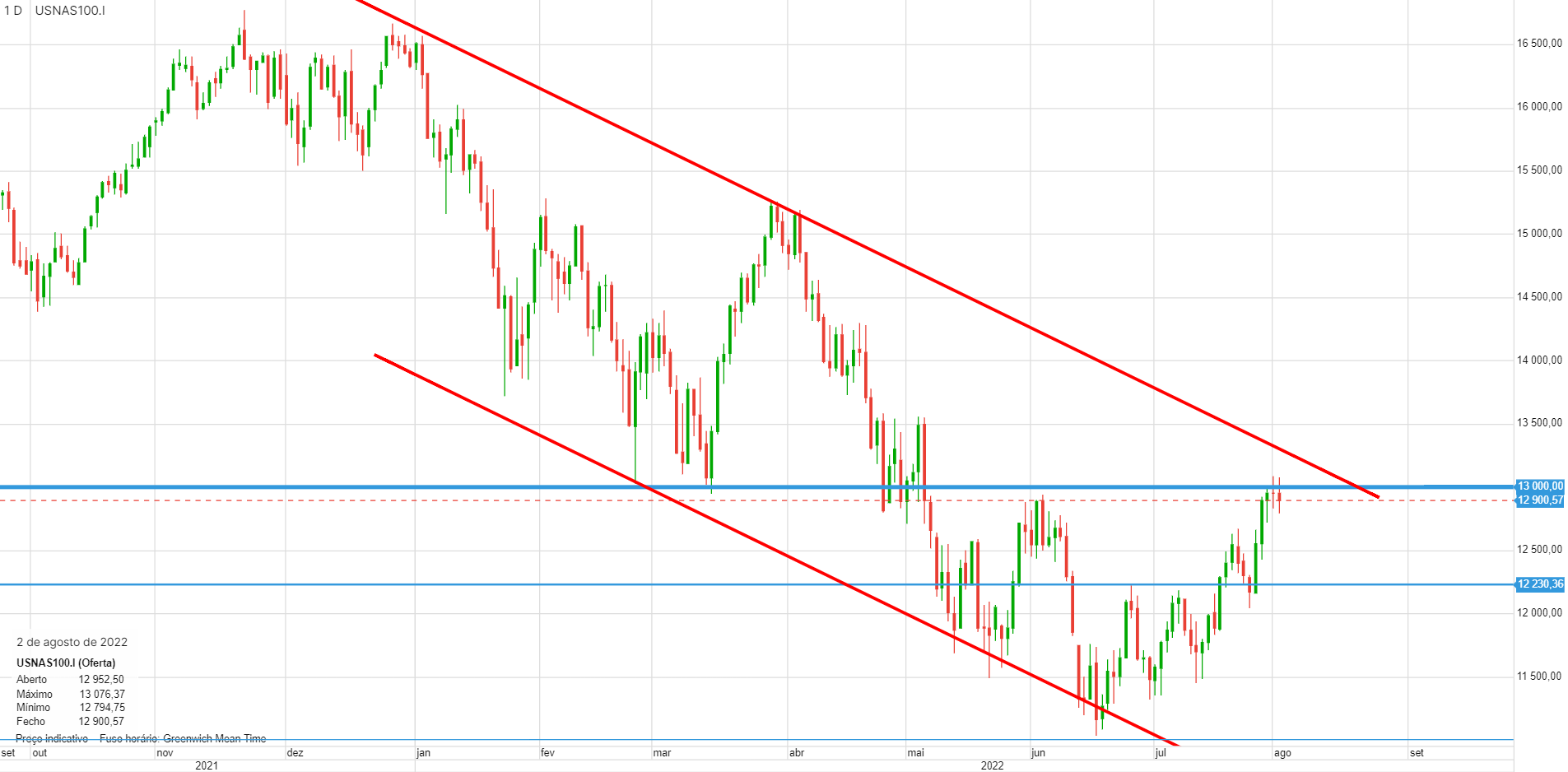 Da mesma forma que no SPX aguardamos pacientemente a (eventual) quebra dos 4200 pontos, como confirmação da reversão da tendência dominante que vigora desde o início do ano, aqui estamos num ponto semelhante, aguardando a quebra da zona dos 13000.