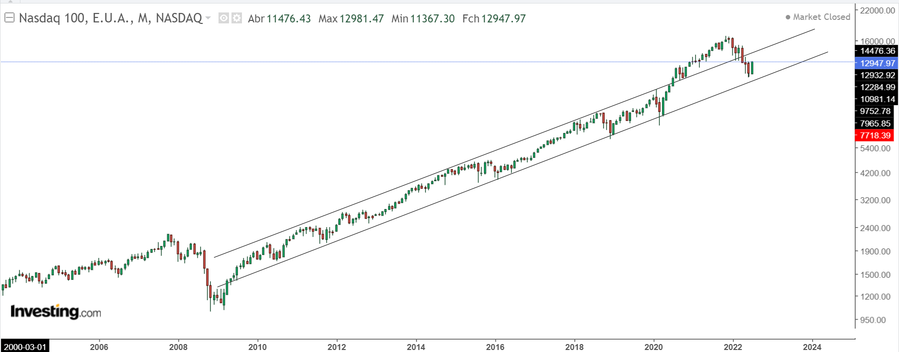 O que também é de realçar, é que o Nasdaq 100 acabou por voltar ao canal ascendente que vem desde 2008 (gráfico mensal), pois a inclinação da subida era muito íngreme...alias, até face ao crescimento real da economia.