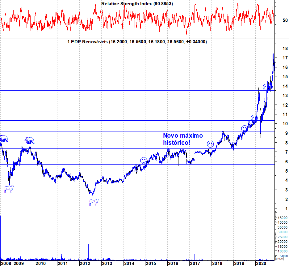 Aqui ficam os gráficos actualizados de mais de 8 anos de "Bull Market" da EDP Renováveis.