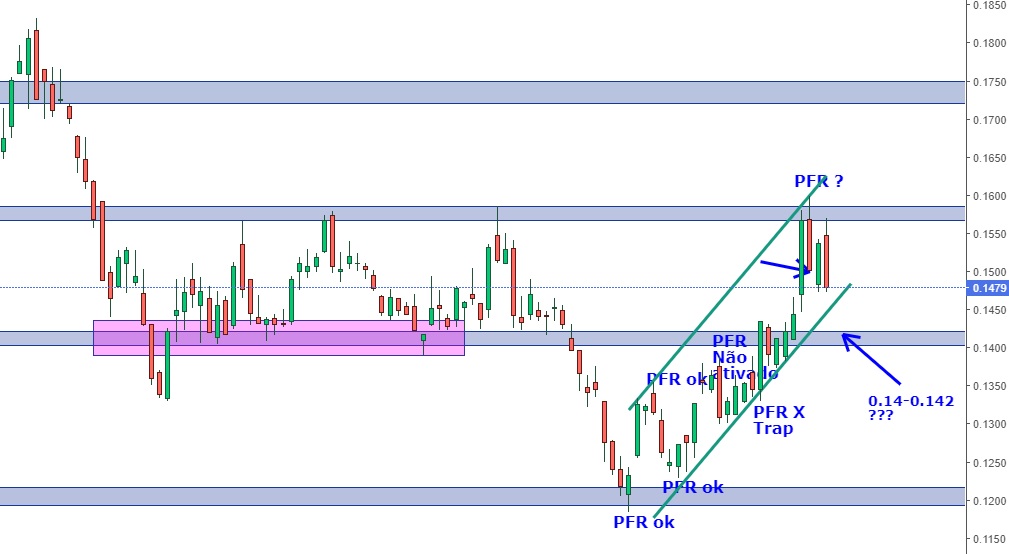 Se o PFR de baixa for ativado (0.1490/0.1495), podemos ter um pullback à zona dos 0.14/0.1420, com stop muito caro nos 0.16!