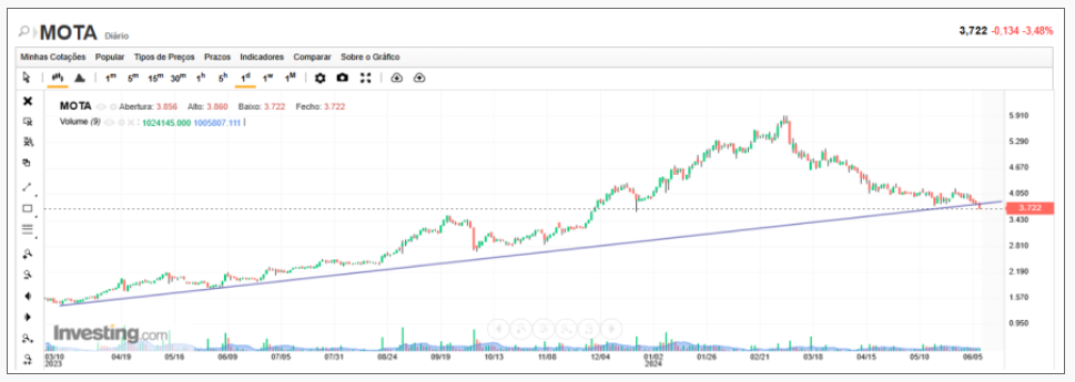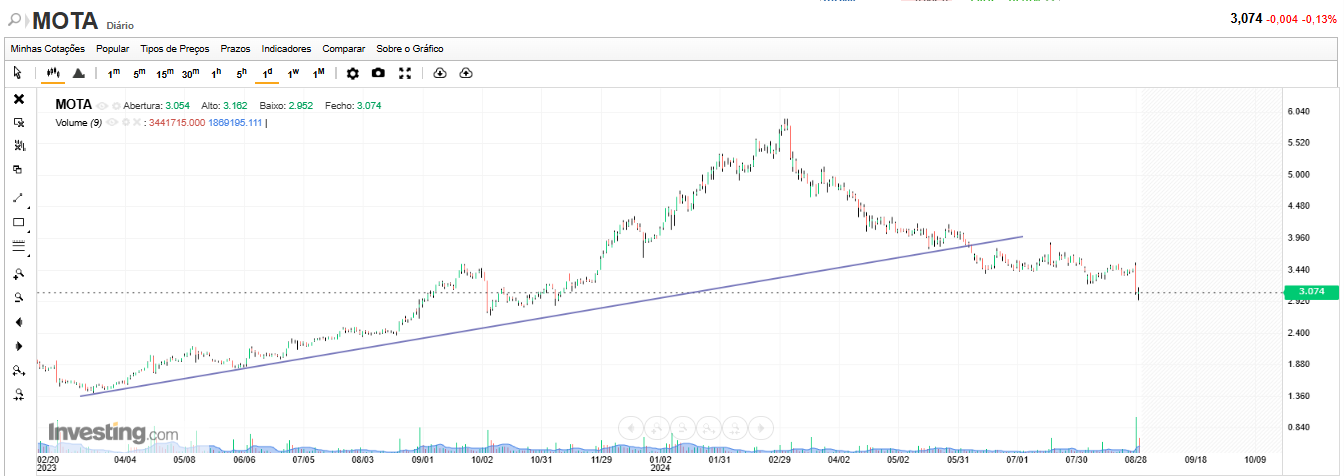 Na minha leitura não vejo força vendedora capaz de deitar a Mota abaixo de 3, se tivesse já teriam dado esse sinal ao mercado. É verdade que a vela é feia, mas pode ser de exaustão de vendedores visando o objetivo 3.