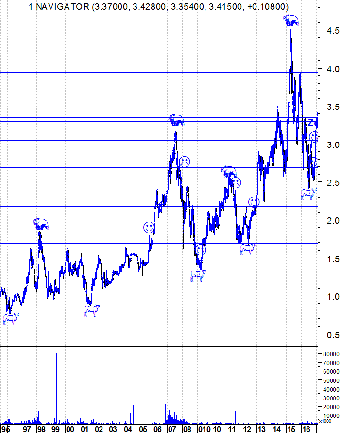 Estava agora a olhar para o gráfico de longo prazo e a ver que este deveria ser o aspecto dos gráficos da Bolsa portuguesa ao longo dos últimos 20 anos: Mínimos e máximos cada vez mais altos, naquilo que seria o percurso normal de uma empresa em Bolsa. Infelizmente, tal não acontece com muitas acções da Bolsa portuguesa.