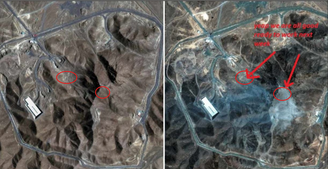 Segundo o Gen. Dan Caine, foram lançadas 6 bombas GBU-57, em cada um dos dois poços de ventilação, tendo a tampa sido "removida" pela primeira bomba, e as restantes 5 desceram pelo poço a 300 m por segundo.