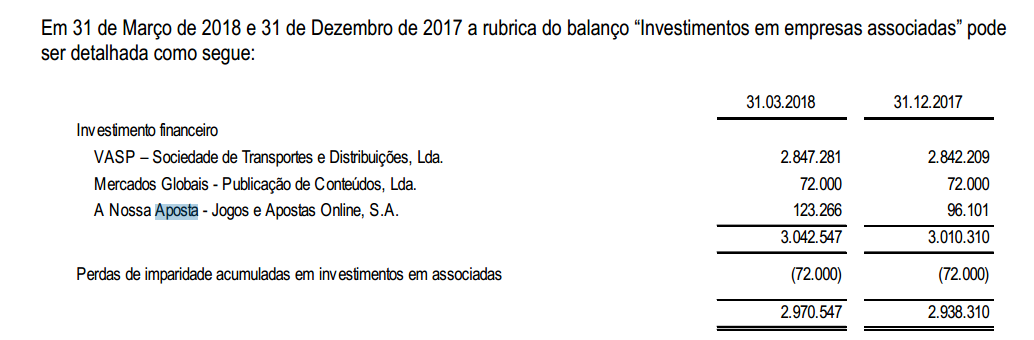 Em 30.03.2018 o valor inscrito em investimentos financeiros na nossa aposta tinha a valorização de 123 mil euros