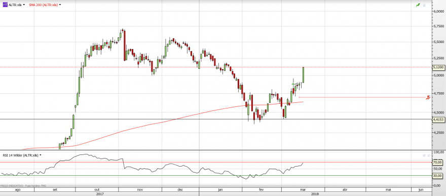 Quanto à Altri, está inegavelmente em bull market, embora discorde com a afirmação do Eagle quanto a não ter sustenção de fundamentais. Esta é uma das poucas empresas do PSI que apresenta melhores fundamentais e perspetivas futuras. Concordo que não tenha suportes válidos e num cenário de correção, poderá corrigir forte, mas não inviabilizará o seu bull market, sendo a sua tendência, após a eventual correção, para cima. Pelo menos até provas em contrário, e essas provas consistirão em quebras fortes de suportes (que estão bem longe neste momento).