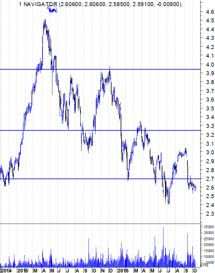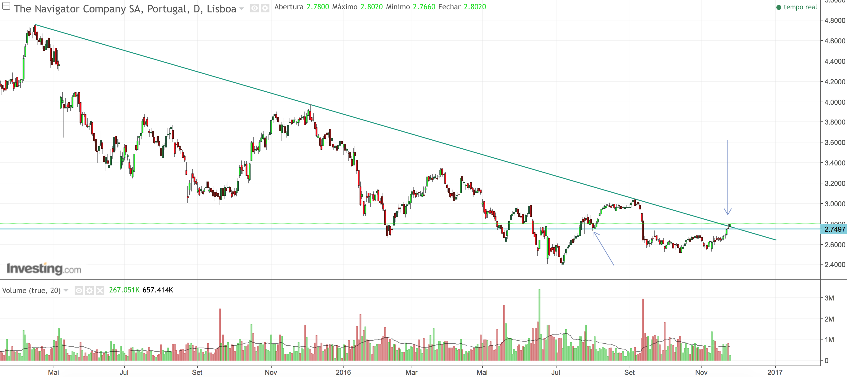 Navigator a tentar quebrar a linha de tendência descendente, ao mesmo tempo que supera a resistência dos 2,75€, anterior suporte. Se conseguir quebrar estas duas situações consistentemente pode ser um bom sinal. Inversão de tendência, para mim, só superando convincentemente os 3,0€.