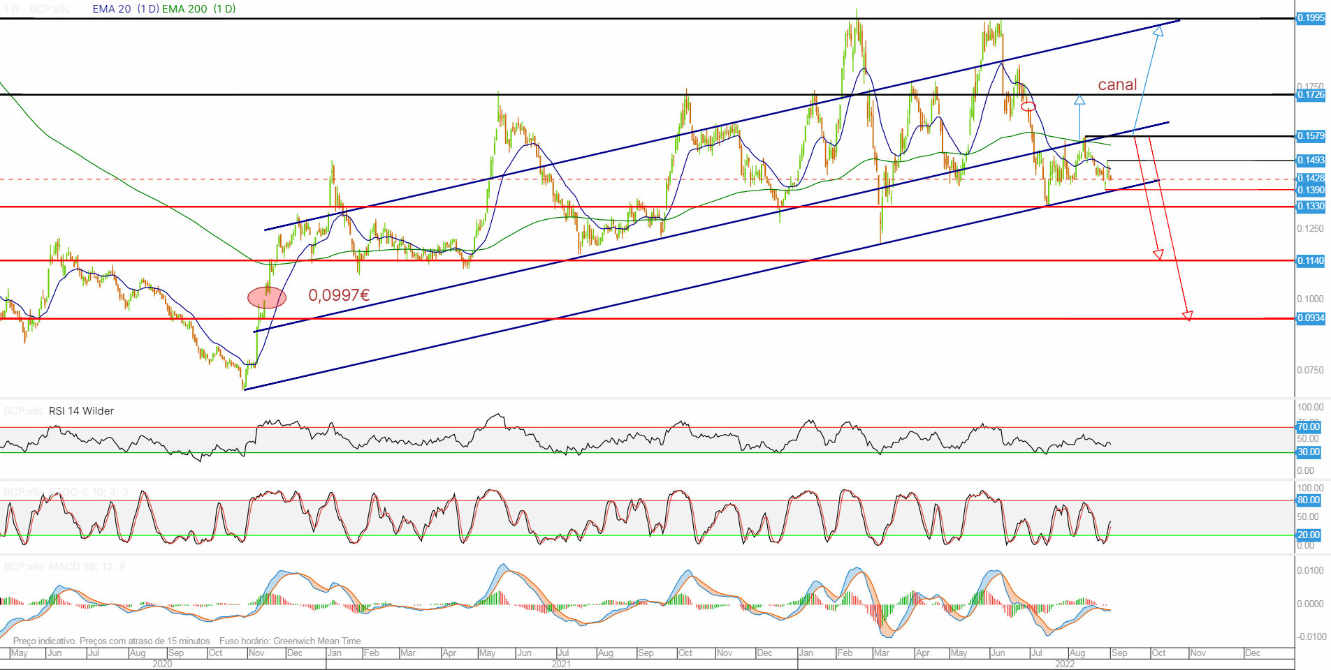 A mim parece que está realmente a atingir o fundo do canal mas parece me um ponto ótimo de entrada. Se rompe este canal parece-me preocupante, embora BCE na quinta feira subindo as taxas de juro em 75 pontos parece ser um ponto importante para a subida do BCP.