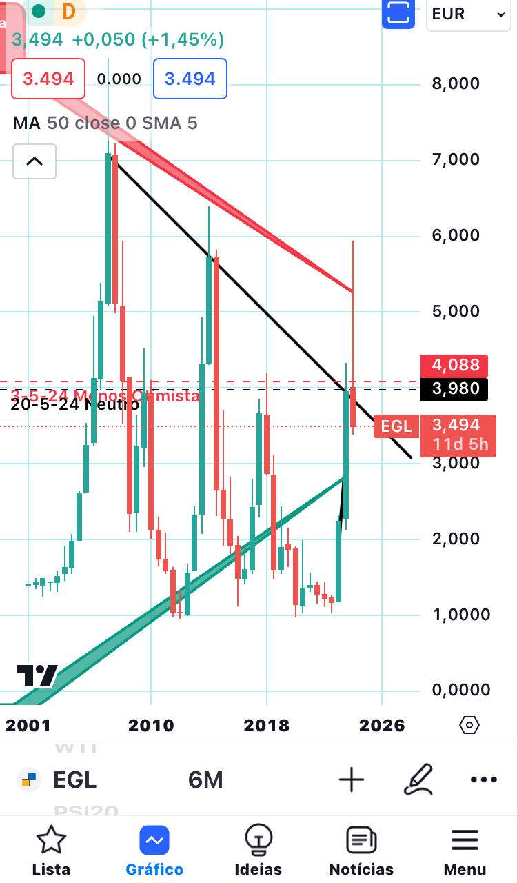 Este é o gráfico semestral da EGL. Não apaguei as outras coisas do gráfico, mas o que importa no que vou dizer é a última candlestick. Acho que o que acontecer até ao final do mês pode ser muito importante, pois é o fecho da candlestick. A candlestick neste momento não parece positiva, mas se o preço subir até ao fim do mês, a situação pode mudar