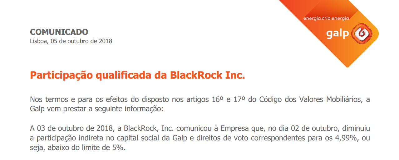 BLACKROCK baixa posições diretas detidas em acções da GALP