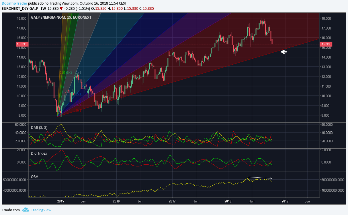 A meu ver, até que seja perdido os 14.60€ ainda continua bull,no entanto requer alguns cuidados,a perda deste valor,o OBV está a revelar já alguma distribuição no semanal o que não é bom.Também estamos a iniciar venda no semanal mas ainda sem valor numérico no adx (acima de 25) para ditar inicio de uma tendência e com indícios de agulhada no didi índex.