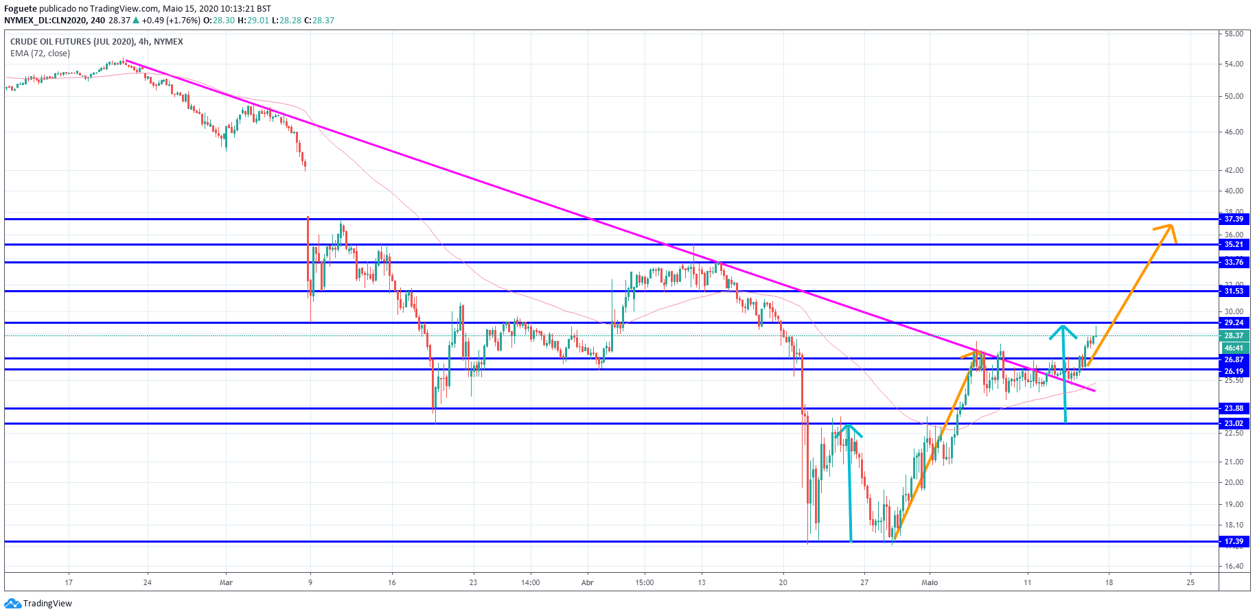 Se bem percebo, numa lógica de contrariar a unanimidade quando a grande maioria estava bearish no crude, entrou longo. E agora que parece um cenário cor de rosa entra curto na resistência que identificou no gráfico.