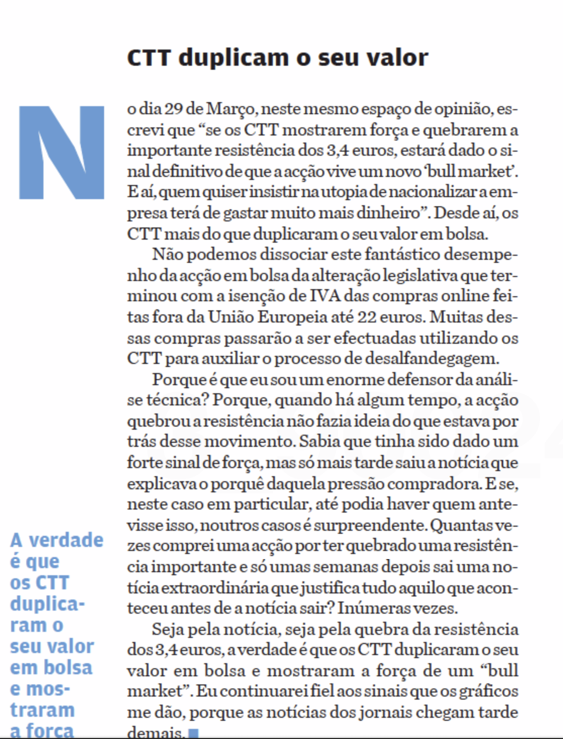 E manténs a coerência pelo que vejo ao dizer que CTT/Mota são ar. Mas a coerência no reasoning não dá necessariamente cash, o meu ponto é esse. Não quero convencer ninguém, mas os mercados não são racionais, longe disso e por que motivo não aproveitar essas “exuberâncias irracionais” como dizia o outro, se a AT até ajuda a sinalizar entradas/saídas...? Basta olhares para os CTT em Março e o triple top fulminado