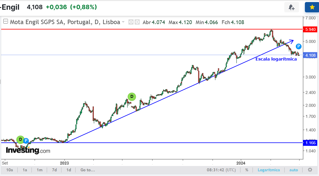 Às vezes, os índices, ações, etc., reagem a suportes numa escala logarítmica e outras vezes na escala regular. Existem vários exemplos. Em vez de se escolher uma pode-se tentar olhar para as duas.
