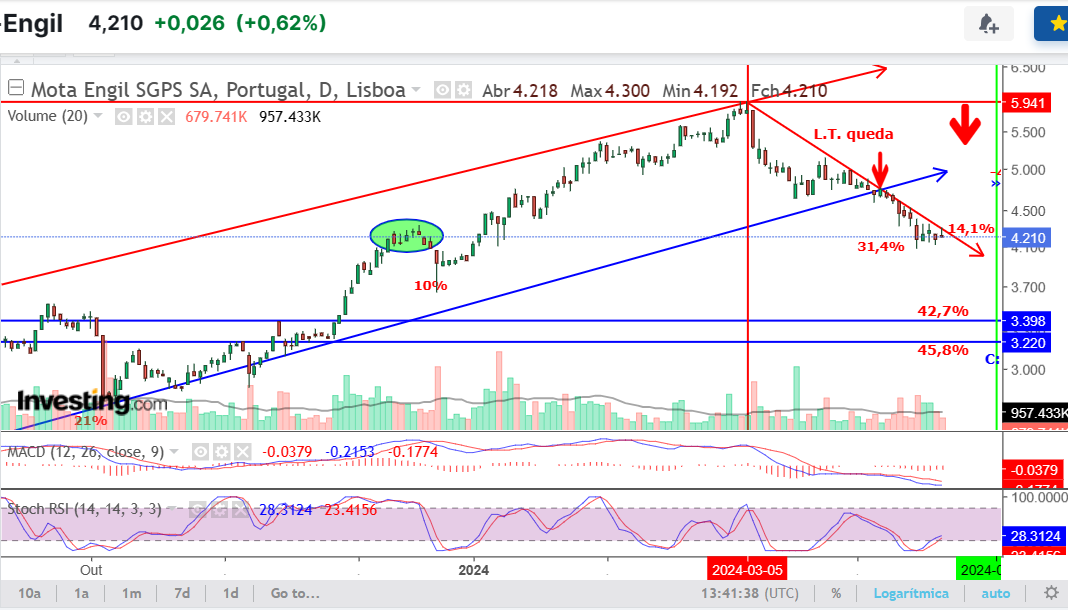 Linha de suporte quebrada por volta dos 4,33...anda ali há dias a testar-la, a agora linha de resistência dando-lhe maior importância. Sem ultrapassar não haverá novidades...