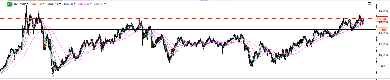 GALP evolui ao sabor do petróleo e por isso é difícil subir acima deste nível , porque neste nível petróleo vai começar a corrigir e GALP também , como se viu na sexta com quebra do brent em 3.3% mesmo ainda antes do ex.dividendo.