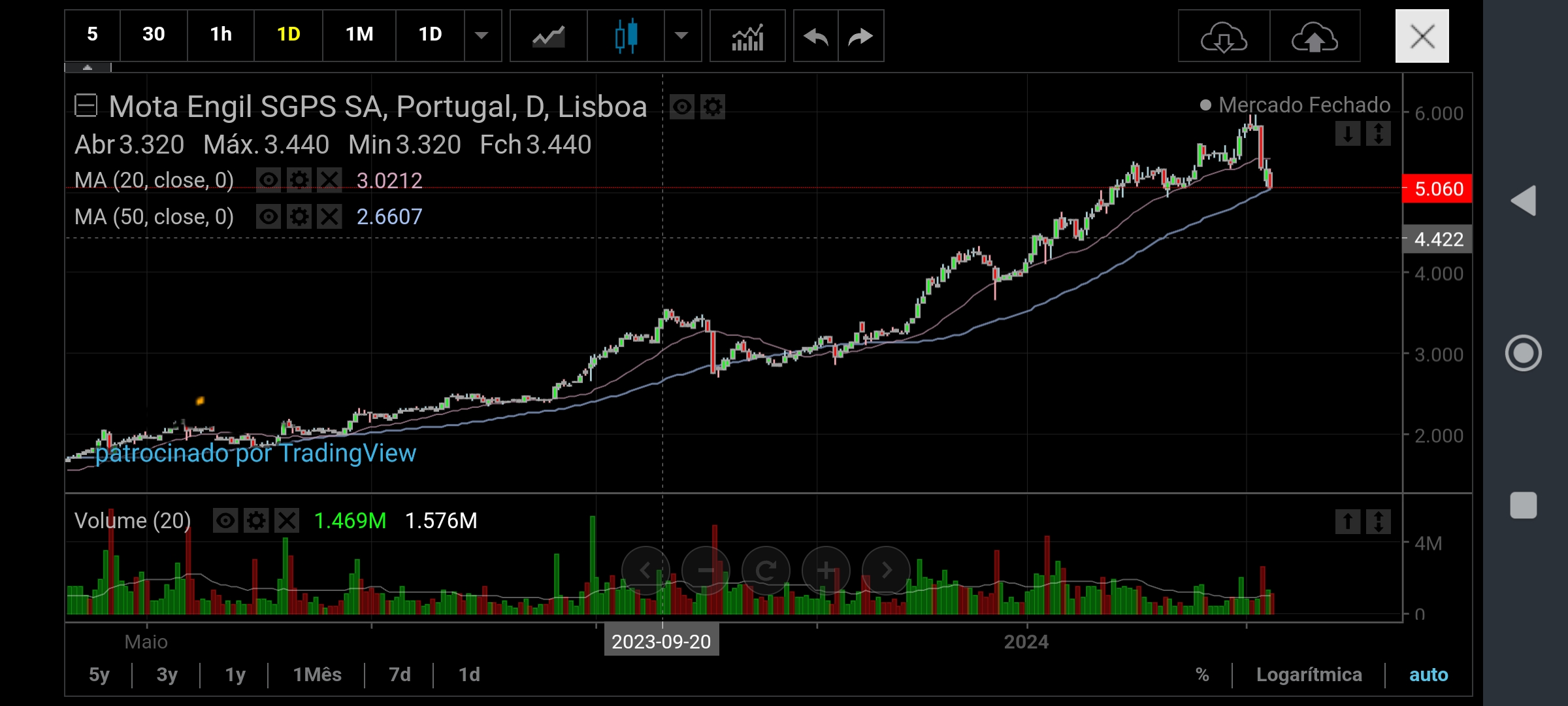 afcapitao Escreveu:ZéManuel Escreveu:Capitão, poderá ser um ponto de suporte, no entanto se o perfurar e estabilizar até aos 4,70 estará dentro da margem de correção dessa média de 50 dias, mas se furar os 4,70 poderá vir aos 4,30 e aí sim será uma grande oportunidade de compra em meu entender.