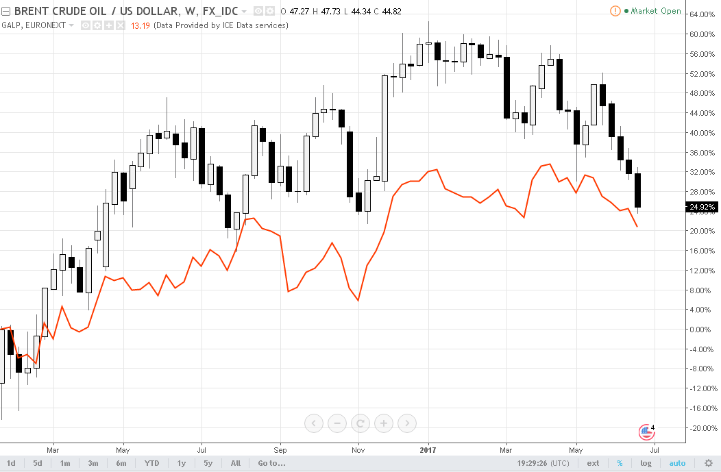 A GALP tem estado a ajustar e retroceder com delay , pois devido a ter vários componentes de lucro em vários negócios e ao peso no PSI, não ajusta em simultâneo com o Petroleo e com delay acaba por seguir a tendência do setor e de uma parte importante dos lucros .