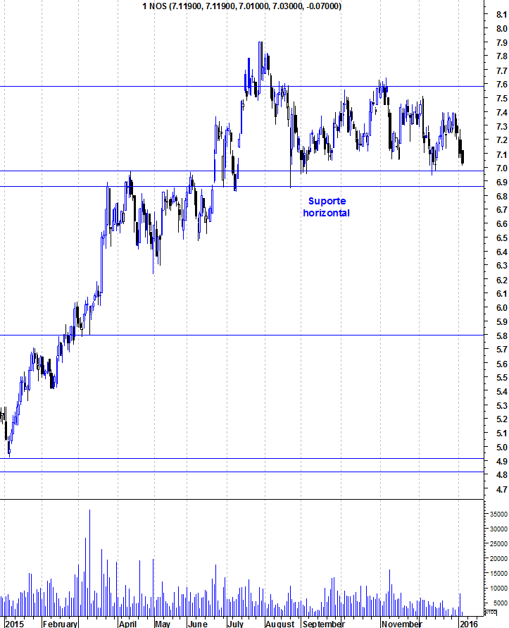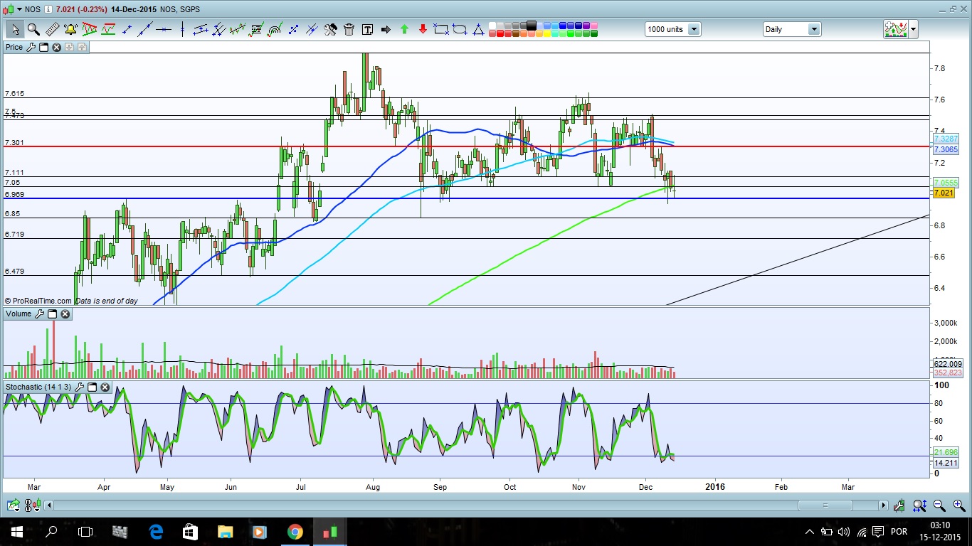 Apesar do espalhanço dos mercados neste início de 2016, a Nos vai conseguindo aguentar-se acima do seu suporte, mantendo intacto o seu "Bull Market" que já dura há mais de 4 anos! Até ao momento, ainda não há qualquer sinal relevante que faça perigar esse "Bull Market" e, enquanto a zona de suporte entre os 6,85/6,95 não for quebrada, os touros dominam em todos os horizontes temporais.