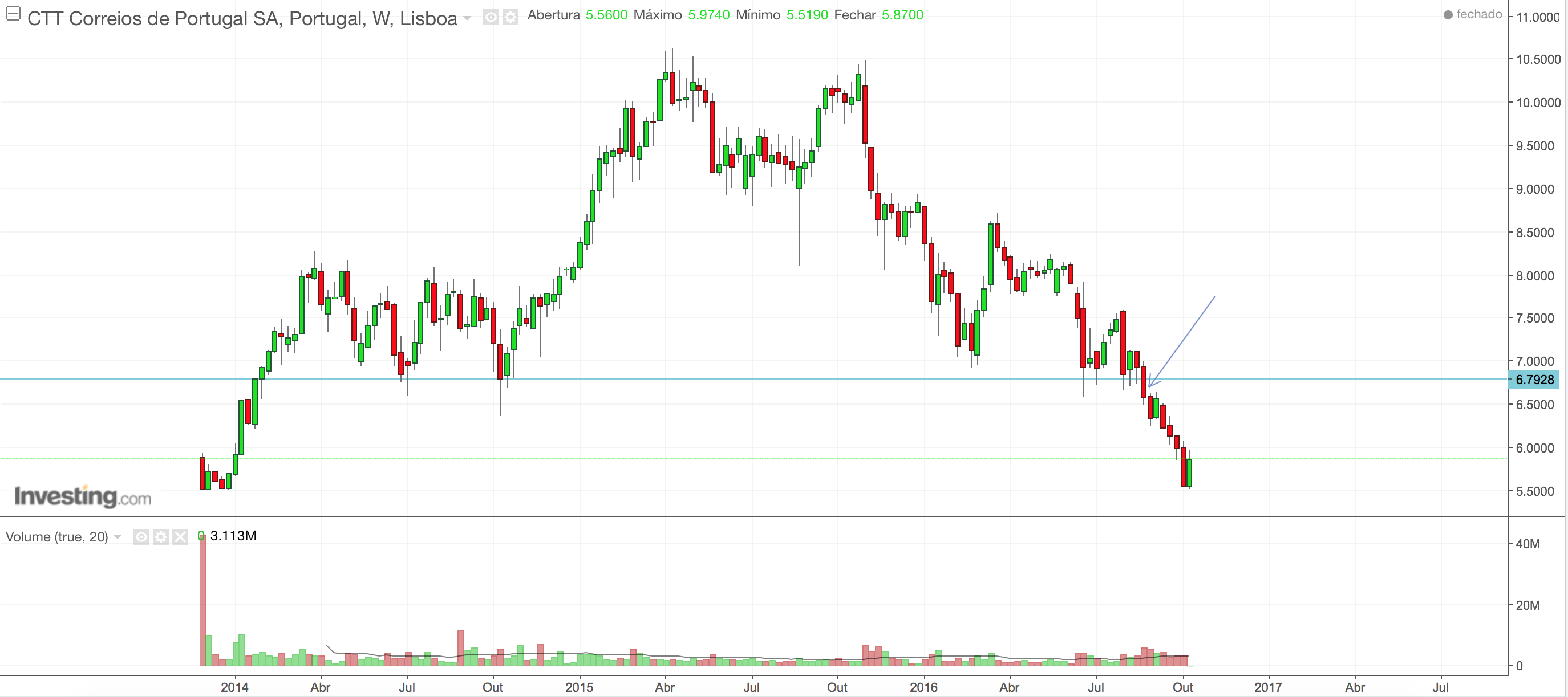 Faz lembrar o aviso que dei recentemente nos CTT, em que era também muito importante que o fecho semanal não fosse inferior aos 6,8€ e quando aconteceu os preços caíram bastante.