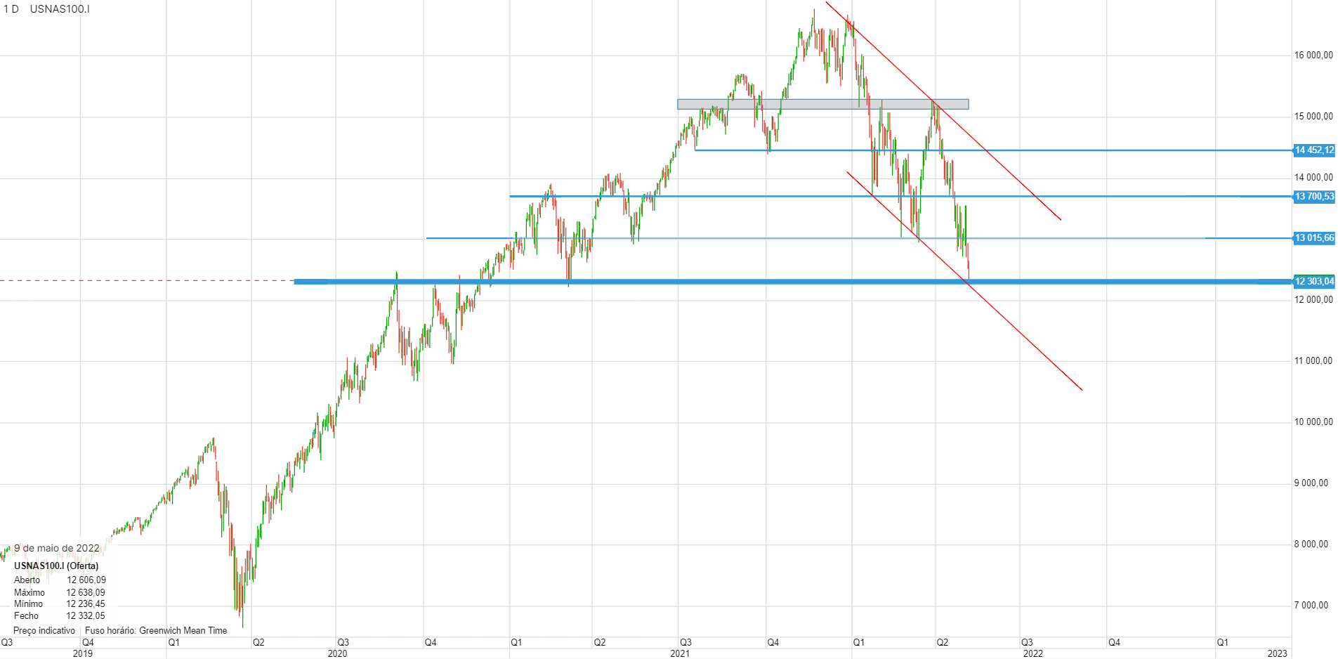 Neste momento acredito que está em cima do ultimo suporte que poderia considerar antes de uma eventual crise como a do .com em que nos vamos continuar a afastar de máximos que não voltaremos a ver nas próximos anos. No .com o NASDAQ demorou 16 anos a fazer novos máximos! Teve de ser vir a geração seguinte para voltar a trazer credibilidade às tecnologias.