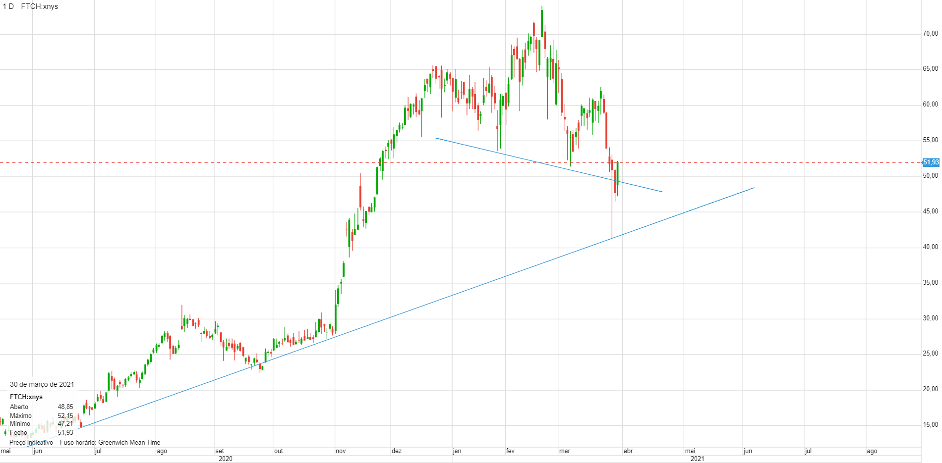 Um bom dia para a farfetch. Com a recuperação de hoje, deu esperanças que o toque na LT ascendente signifique um ressalto. Mas, o dia de hoje, ainda não altera o panorama geral de curto prazo, e esse é negativo.