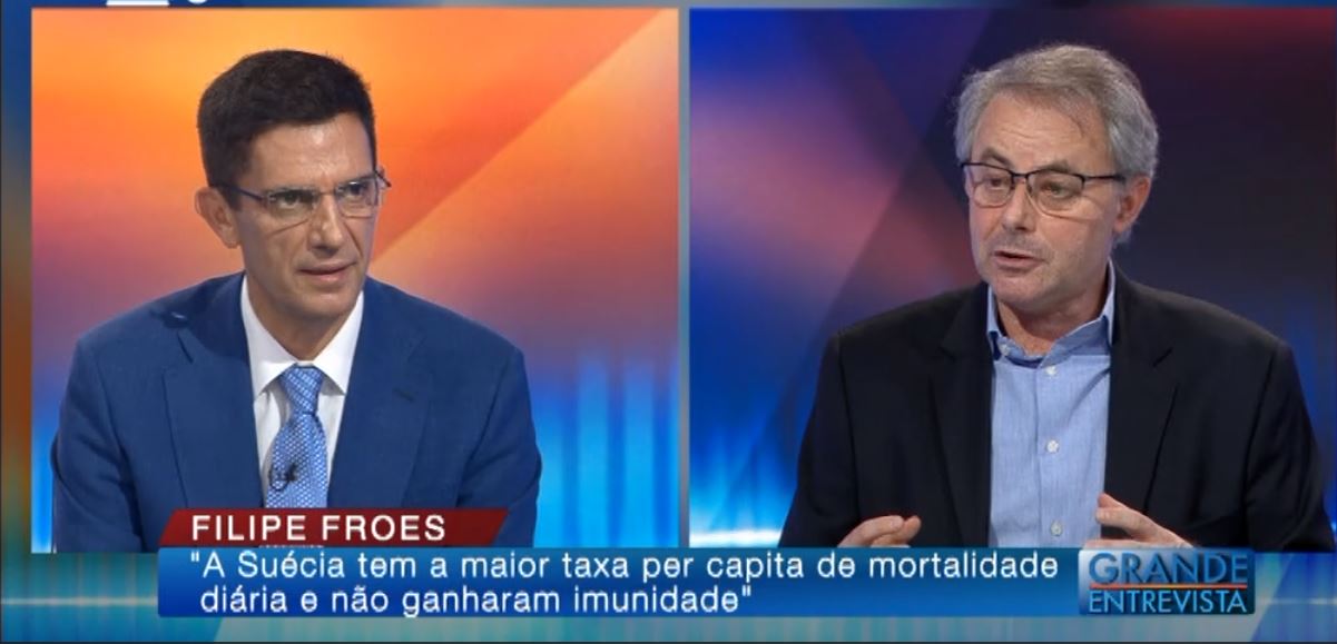 - Minuto 19:15: “Deixe-me só acabar…imaginemos agora que nós fazíamos uma espécie daquilo que fez a Suécia…”deixa tudo aberto”…temos um estudo da Escola Nacional de Saúde Publica que disse que só na primeira quinzena de abril, se não houvesse confinamento nós tínhamos o triplo de necessidade de doentes ligados a ventiladores e passaríamos de 226 para 700 e tal…significa que tínhamos ultrapassado a nossa capacidade de ventiladores. E o que é que isso significa? Significa que quando nós temos a nossa capacidade ultrapassada em UCI, nós entramos em rutura e nós vimos a rutura em Espanha e vimos em Itália. E Então nessa altura não são só as pessoas com covid que morrem, por uma razão simples, as pessoas com covid porque não há capacidade para as tratar, por nós já não temos e todas as outras pessoas que tem doença também morrem”.