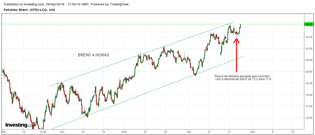 Os dados estatísticos de Bulkovski apontam para um alvo na ordem dos 13€ (cerca de 20% acima da resistência definida pelo lado superior do triângulo). Dito de outro modo, criam a expectativa de que a acção vá dos 11,10 € aos 13 €, com possíveis recuos pelo caminho. É difícil adivinhar a posição dos recuos (na perspectiva de quem queira entrar a meio do jogo). Sabe-se que as quebras nos triângulos ascendentes estão condicionadas por factores, digamos, externos à figura. Por exemplo, a evolução do preço do BRENT (talvez o factor conjuntural mais importante) ou a resistência de 12,3 € (apontada por Ulisses). Quando o BRENT cedeu um pouco, na semana passada, a cotação ajustou ligeiramente: passou de 12,2 para 11,8 (by the way apanhou o meu stoploss). Enfim, não é imprudente arriscar a jogada dos 12€ aos 13€, mas compreende-se quem tome a opção de aguardar um throwback para entrar no intervalo [11,4; 11,6]. É o meu caso, mas o petróleo não está a ajudar e a indecisão pode fazer voar os 2 pássaros. Deixo o gráfico do petróleo onde se nota muito bem o pequeno recuo da semana passada.