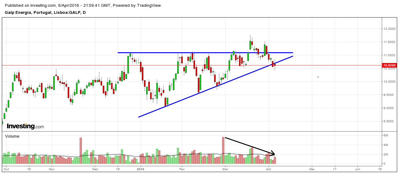 Neste ponto, o leitor, que ainda está pacientemente a acompanhar-me, deve observar o gráfico da GALP que junto em anexo. Em posts anteriores, neste tópico da GALP, defendi que parecia estar a formar-se, no gráfico diário, um triângulo ascendente, e explicitei a estratégia que me parecia mais adequada para lidar com este fenómeno.