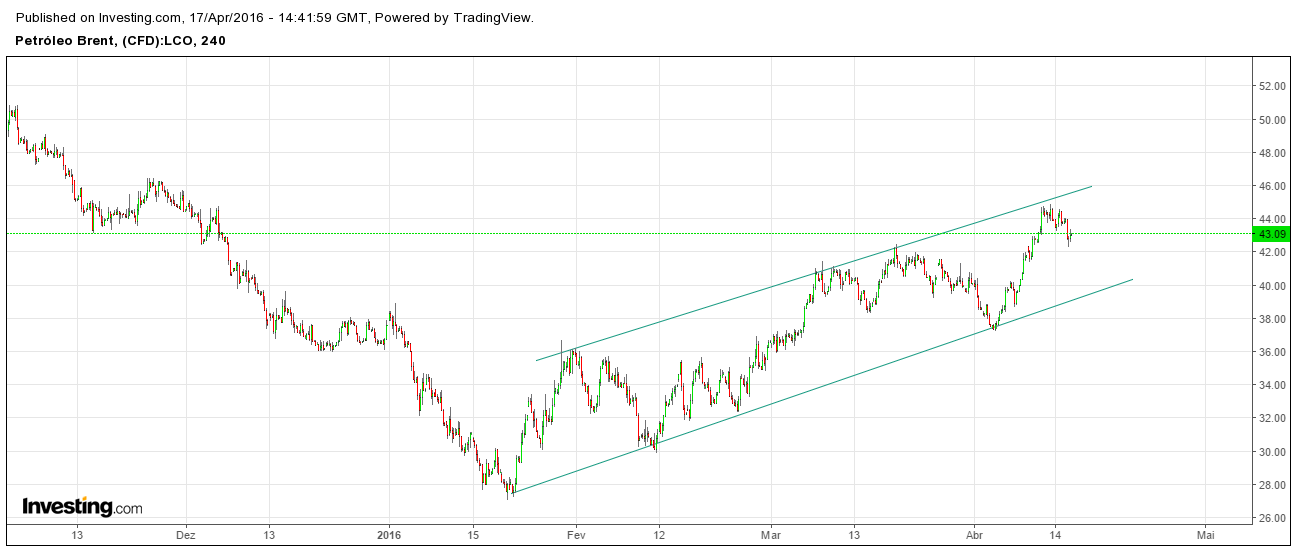Há um belo GAP no time frame Diário ainda por fechar na casa dos 9.63, e os 9.30, os stcoks dos EUA terão aumentado, o congelamento da produção é uma miragem, a procura é insuficiente em relação à oferta, e se o dolar deixa de ser "amarrado" como está a ser, as coisas podem complicar-se...