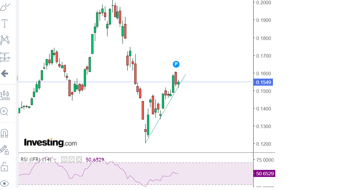 Acho que ainda não esgotamos o movimento de subida, mesmo com a resistência ali por perto mas não sei se terá força para neste movimento ir até lá acima, aos 0,20. Se passar a resistência e o ambiente otimista/de expectativa positiva se mantiver não vejo nada que o impeça em meia duzia de sessões.
