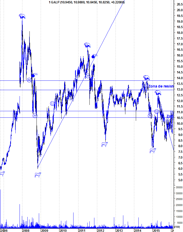 A Galp continua a mostrar o inconformismo dos últimos 4 meses, conseguindo um excelente desempenho, mesmo com o PSI esfrangalhado. Nesta altura, volta a estar na zona de uma resistência muito forte e importante. Caso seja quebrada, os touros deixam apenas de estar no comando da situação no curto e médio prazo e asseguram também o domínio no longo prazo.