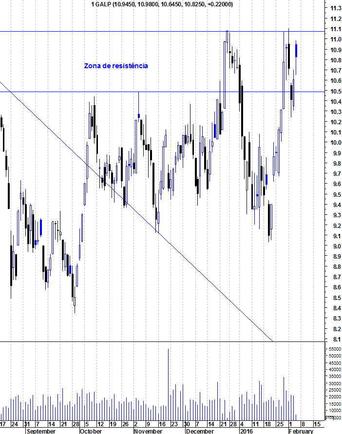 Desde o final de setembro do ano passado que a Galp tem estado numa tendência altista, formando um canal, isto depois da confirmação do rompimento da Ltd que vinha desde meados de maio 2015.