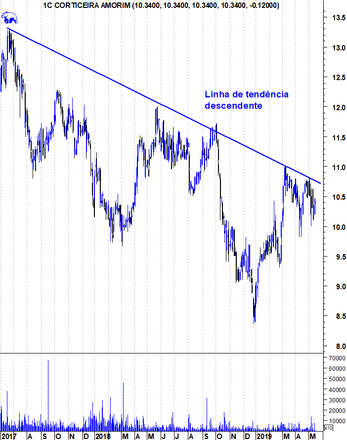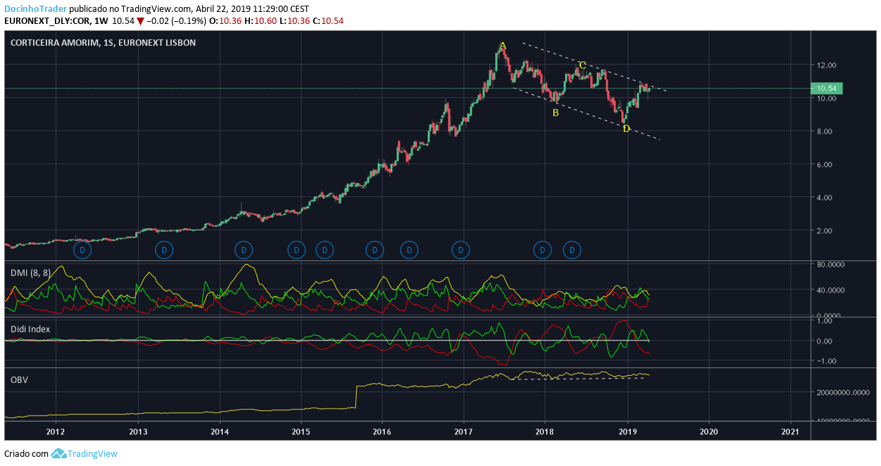No entanto, a partir do Verão de 2017, a acção iniciou uma correcção e uma tendência descendente. Quem tem acções compradas a menos de 1 euro, não deve estar preocupado por agora terem corrigido dos 13 até à zona dos 10 euros, mas a verdade é que são 2 anos de tendência descendente, num movimento perfeitamente normal depois do autêntico voo rumo à Lua dos anos anteriores.