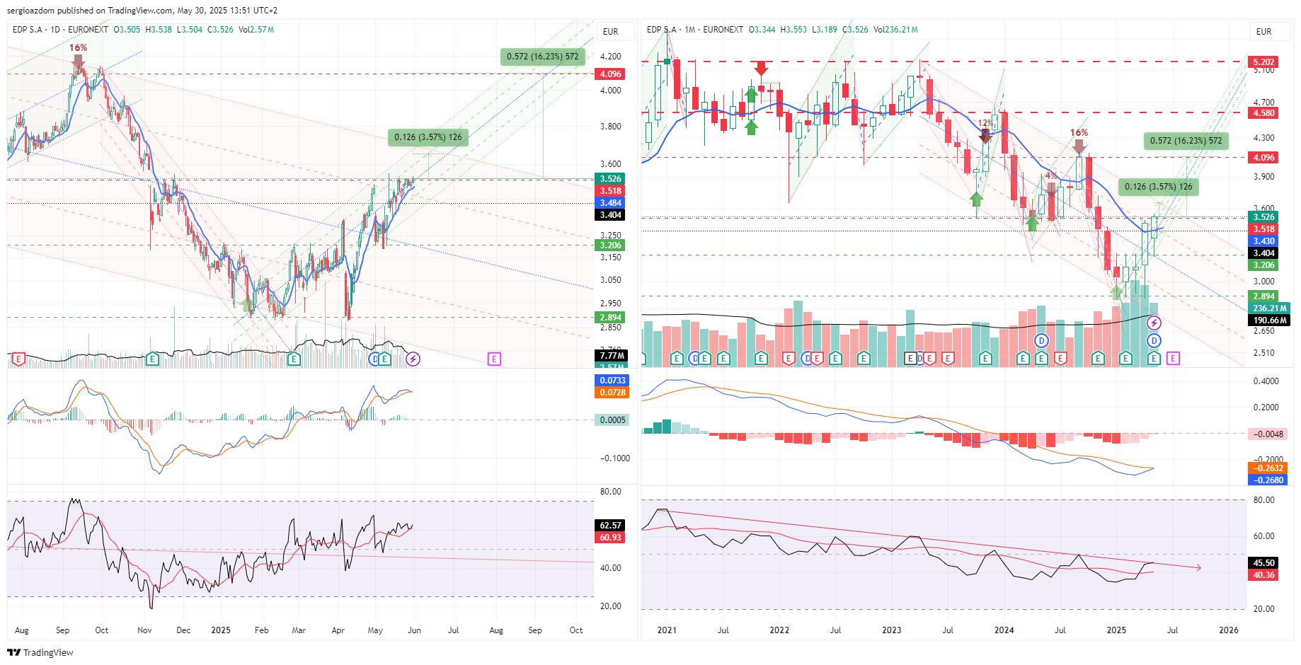 A cotação da EDP e EDPR parece que bateu no fundo em Abril e está agora a recuperar o valor justo. Está com força e (na minha singela opinião) a médio / longo prazo recomendam-se.