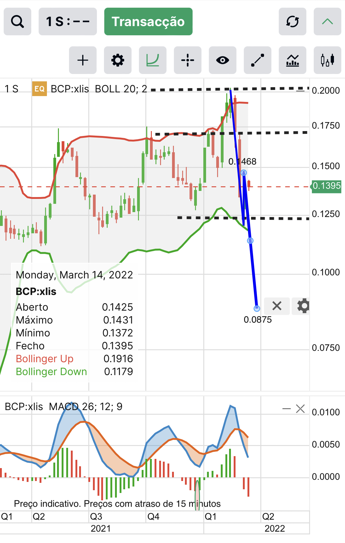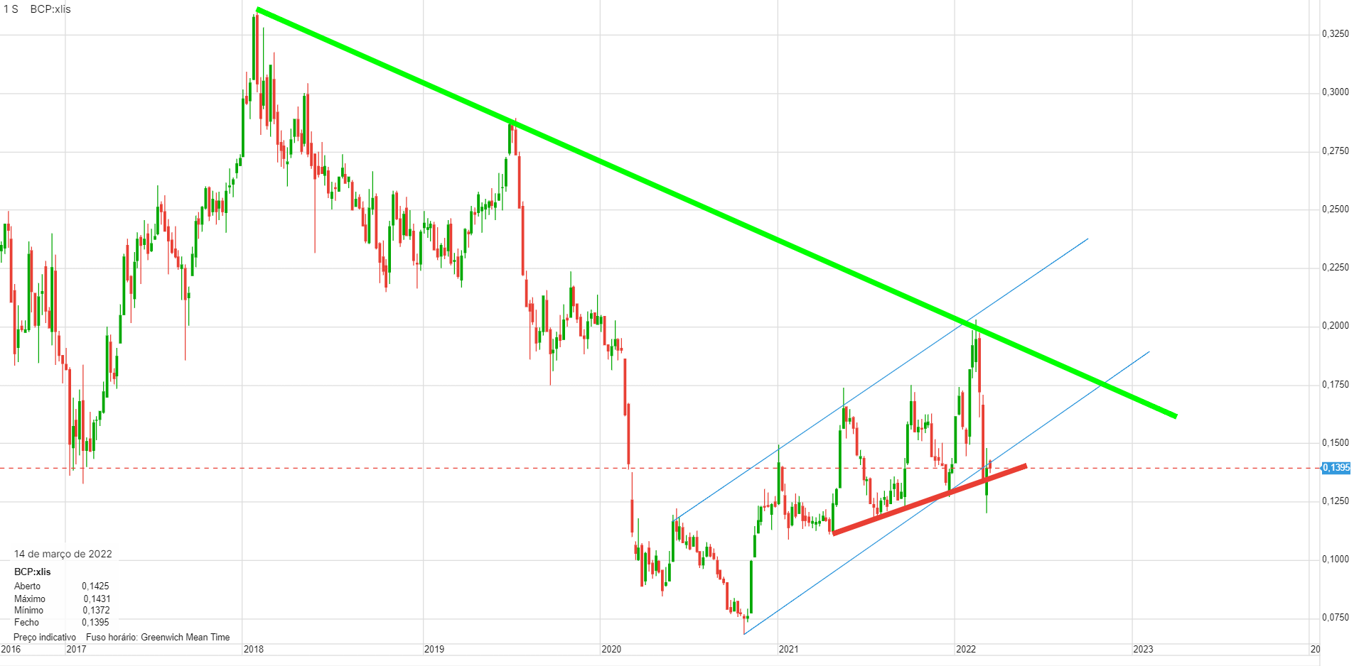 Mas para mim, a linha mais importante é a que une os 3 máximos, a verde. Enquanto não a passar, está sempre em tendência descendente.