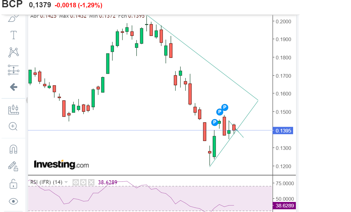 A tentar espacionar nos 14. Se se perceber que está pr´ximo um acordo o BCP fará um disparo forte que o poderá levar a 20 em três dias de verde.