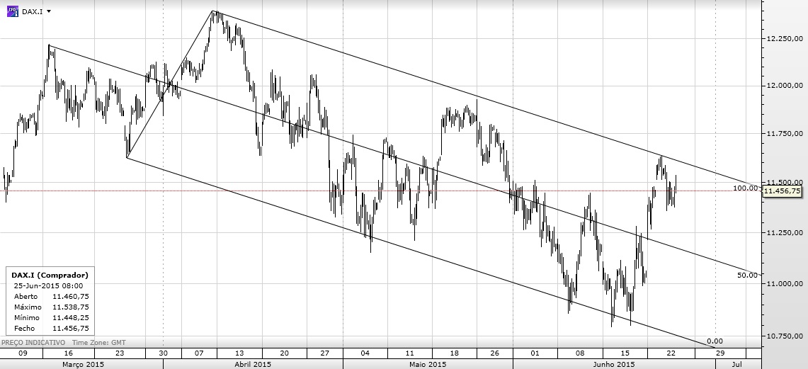 O DAX vai no 2º lower high e existe probabilidade de marchar para o 3º lower low. O último high é referência para stop, a linha média central é o objetivo primário.