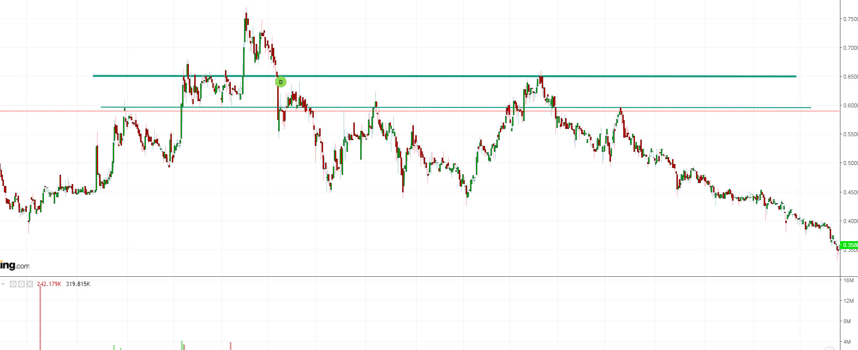Boas, isto significa que batendo na resistência 0.65€, volta a cair?? ou estou a interpretar mal esse gráfico!!