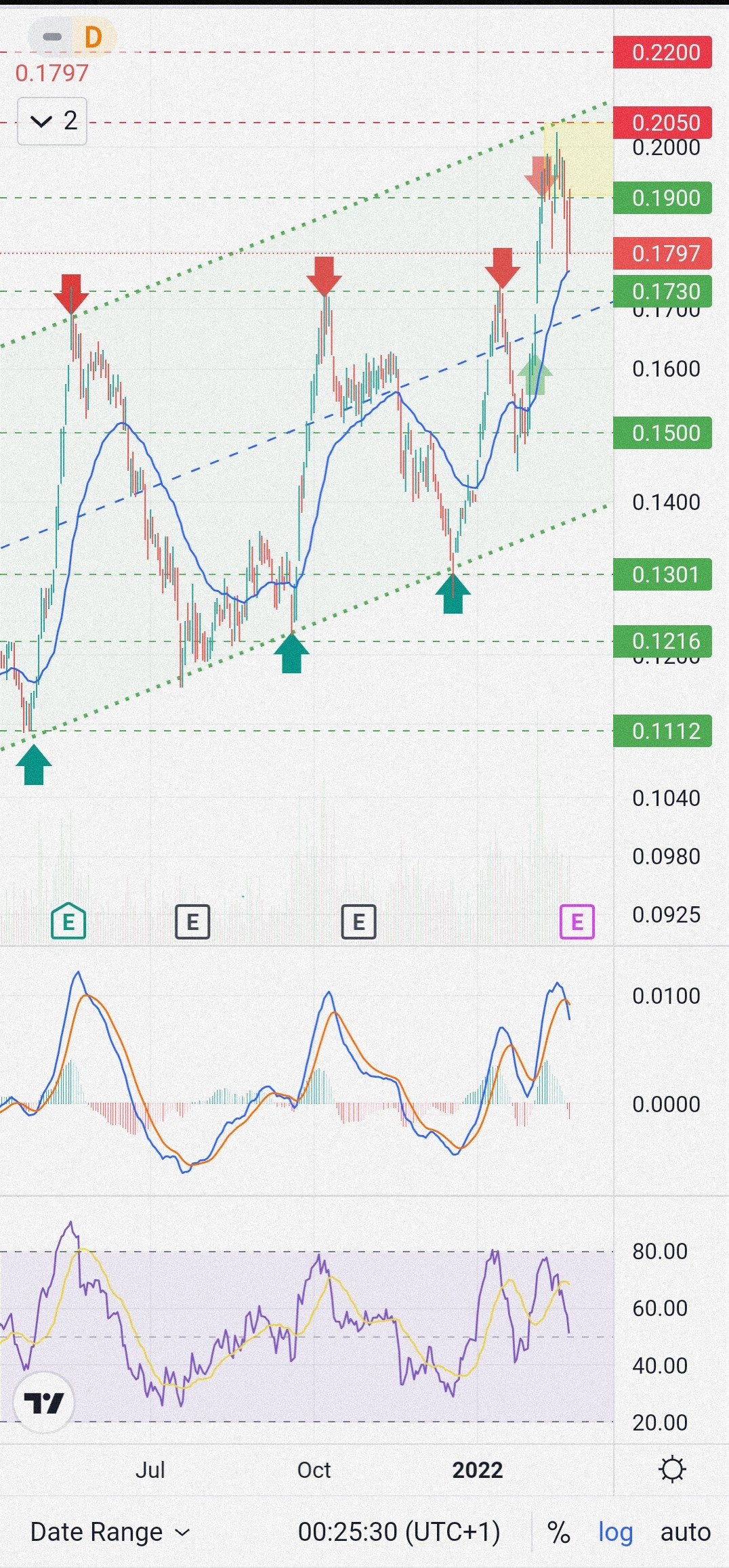 um máximo que toca na parte superior do canal e que, a repetir o padrão anterior, tem boas boas probabilidades de voltar a descer até ao fundo do canal (que nesta altura está à volta dos 0,14€).