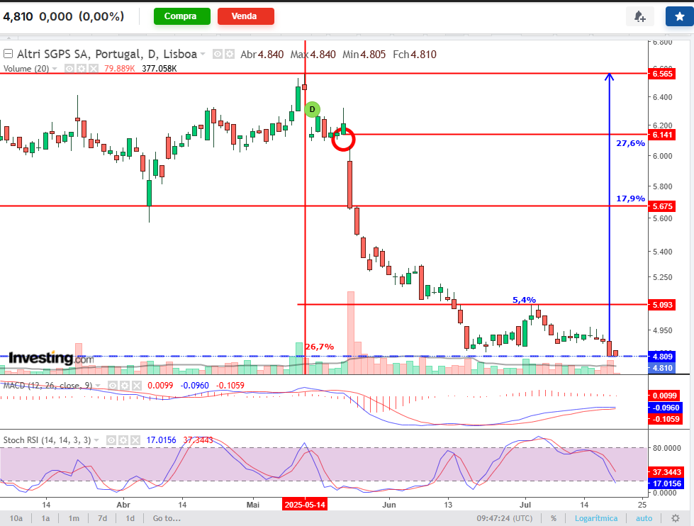 Acredito que faça aqui um ressalto, mas os fundamentais estão degradados com a tendência de descida do dólar. Se o dólar afundar a Altri não aguenterá esse suporte.