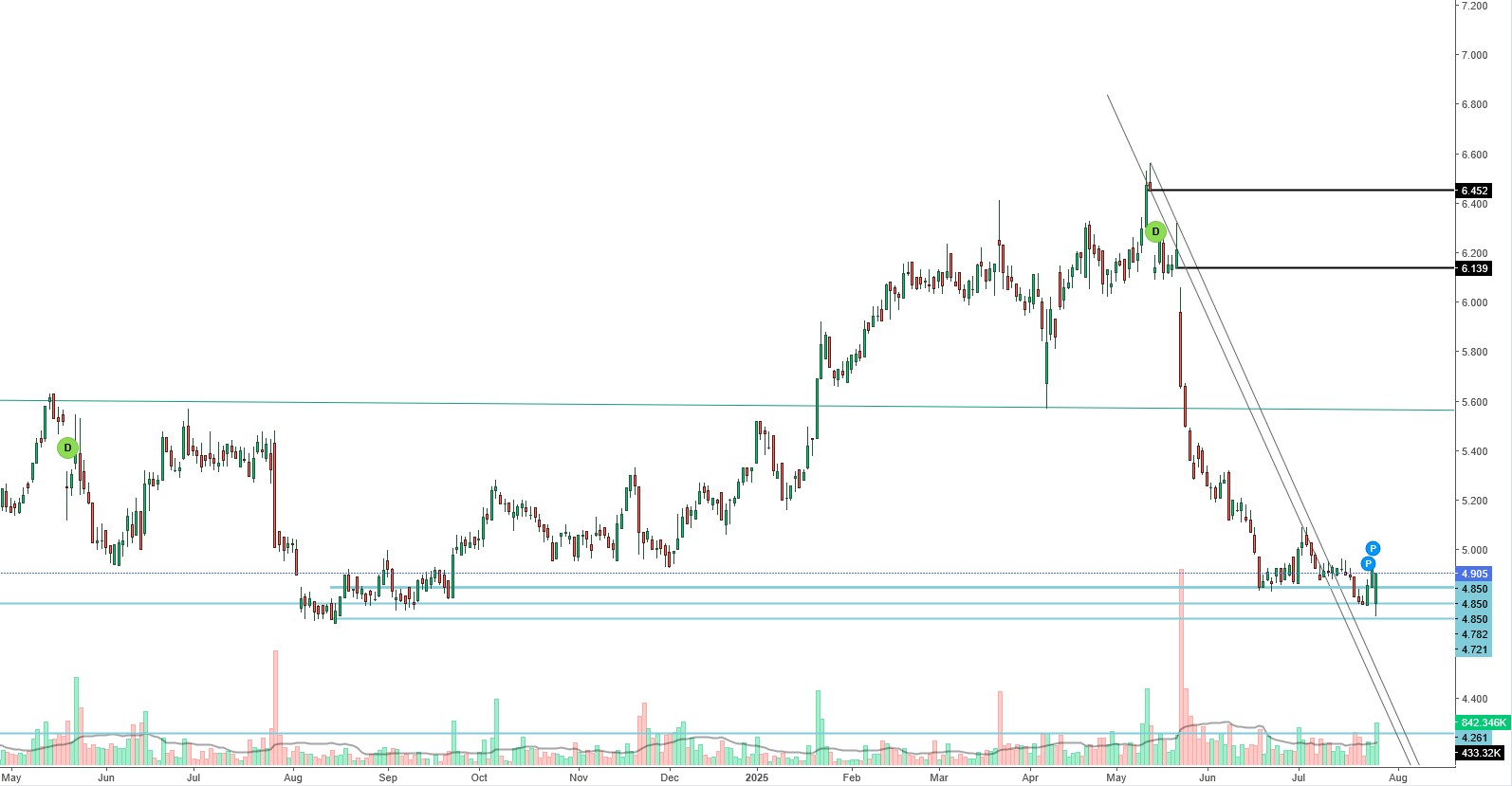 ValeAquilino... Vale o que vale! ( a minha opinião) Comprar a 4,72 e esperar um ressalto até aos 4,87 e ganhar 3%.A ideia é observar com atenção — se os 4,72 não aguentarem, vende-se para evitar perdas maiores e depois procura-se nova entrada na região dos 4,29. A partir daí, é ir acompanhando o comportamento do ativo, com paciência e disciplina. O importante é respeitar os níveis definidos e não se precipitar.